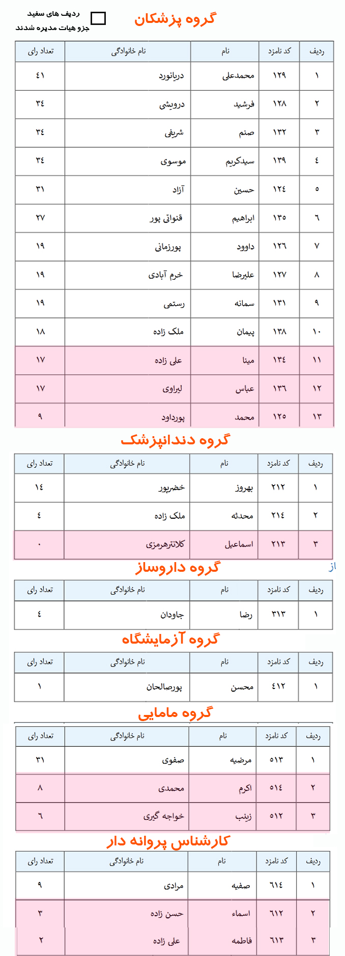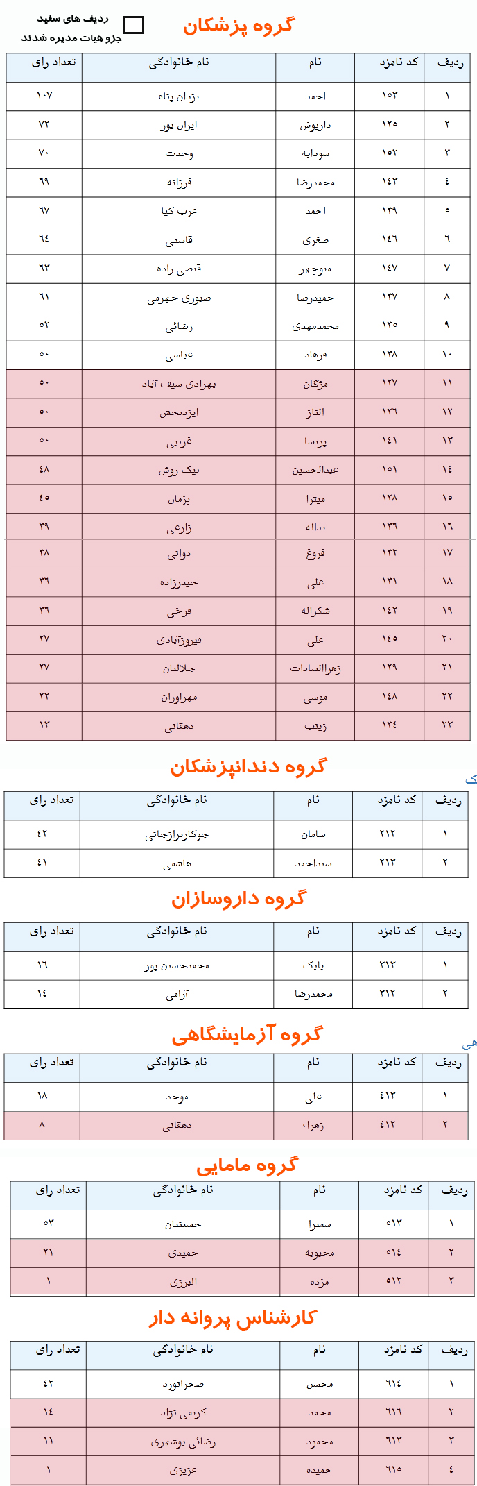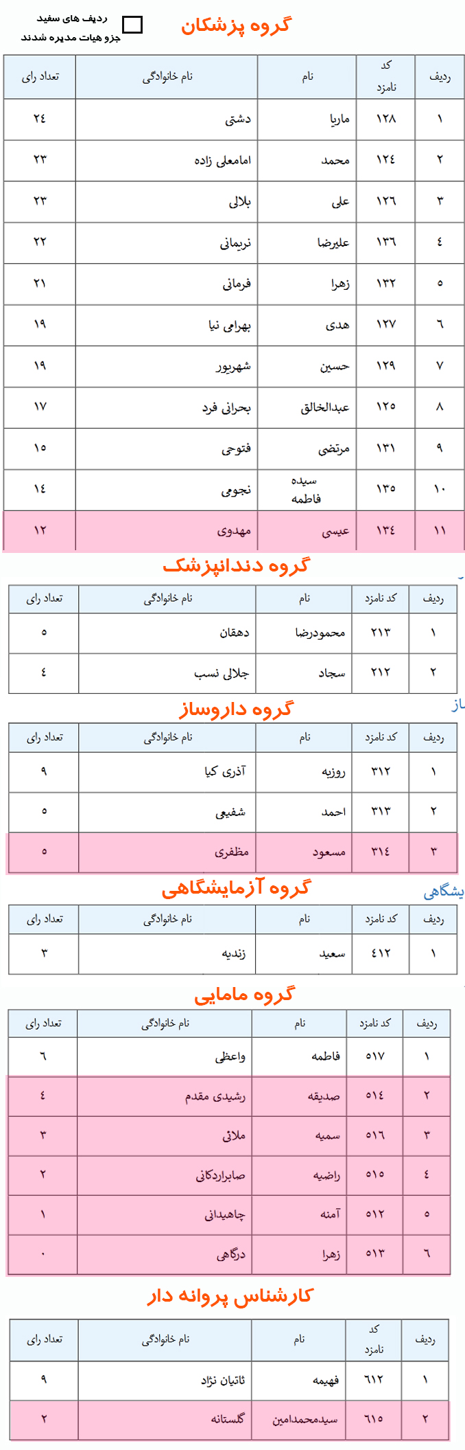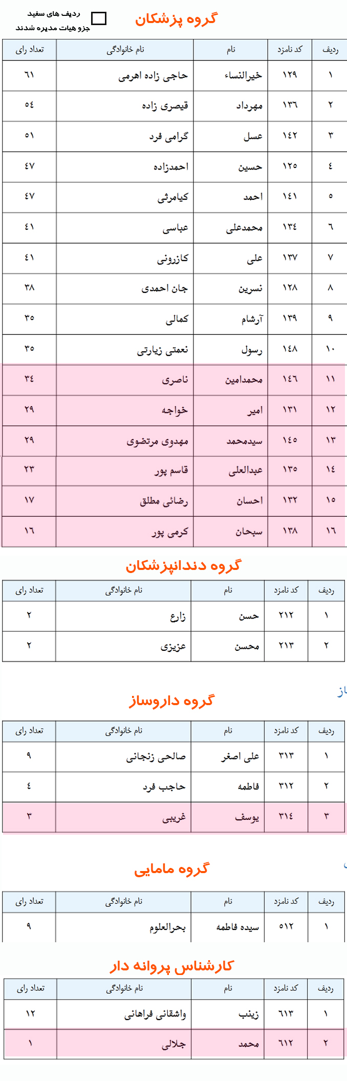 نتایج اولیه انتخابات هیات مدیره نظام پزشکی به تفکیک حوزه های انتخابیه به شرح زیر است: (ردیف های سفید عضو هیات مدیره شده اند)