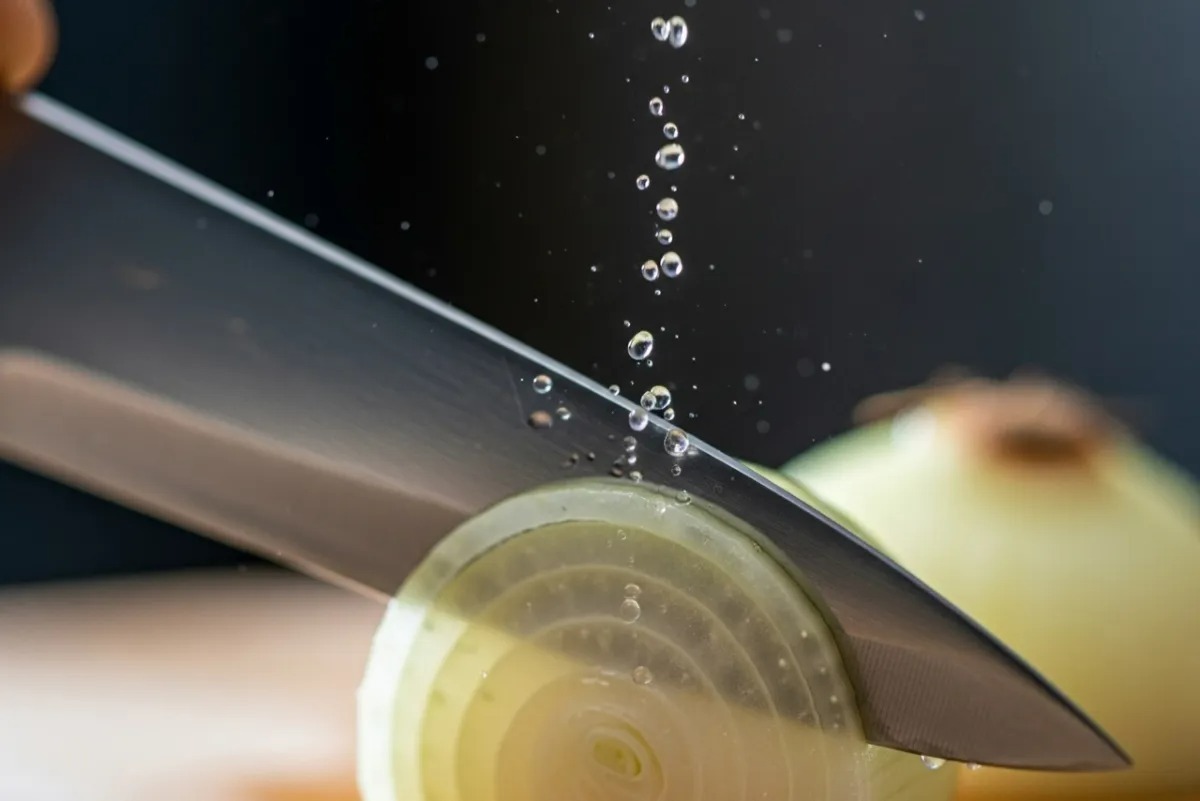 هوشنگینژاد و همکارانش در دانشگاه کرنل، با استفاده از یک دوربین پرسرعت و یک گیوتین مینیاتوری، فرآیند برش پیاز را با تیغههایی با درجات تیزی متفاوت بررسی کردند. نتایج شگفتانگیز بود: زیر هر لایه پیاز، سلولهای حاوی مایع یک سیستم تحت فشار ایجاد میکنند. چاقوهای کند برای بریدن پوست به نیروی بیشتری نیاز دارند و در نتیجه سلولهای بیشتری را له میکنند. این فشار اضافه، شیره پیاز را مانند فواره به اطراف میپاشد.