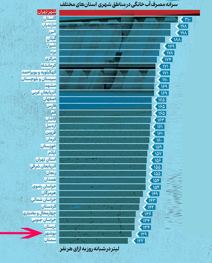 تنها استان سمنان با سرانه مصرف 122 لیتر رتبه پایین تر از بوشهر دارد.
