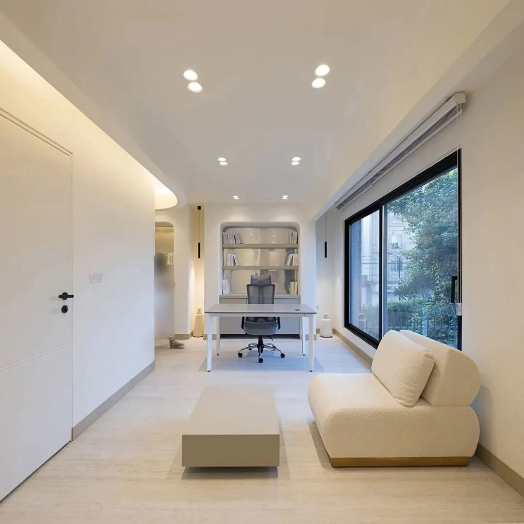 با درک حساسیت عملکرد جدید فضا، طراحی داخلی پروژه بر پایهی دو اصل کلیدی شکل گرفته است: آرامش روانی و پرهیز از تحریک حسی ناخواسته. انتخاب رنگهای روشن و ملایم، بهگونهای بوده که ذهن مخاطب را درگیر نکرده و در عین حال، حس سبکی و سکون را القا کند. اما یکی از اصلیترین مداخلات طراحی، در شیوهی نورپردازی غیرمستقیم نمود یافته است؛ چرا که در فضای درمان روانشناختی، نمیتوان از وضعیت ذهنی و حسی تمامی مراجعهکنندگان آگاهی داشت و این خود، مسئولیت طراح را دوچندان میکند.