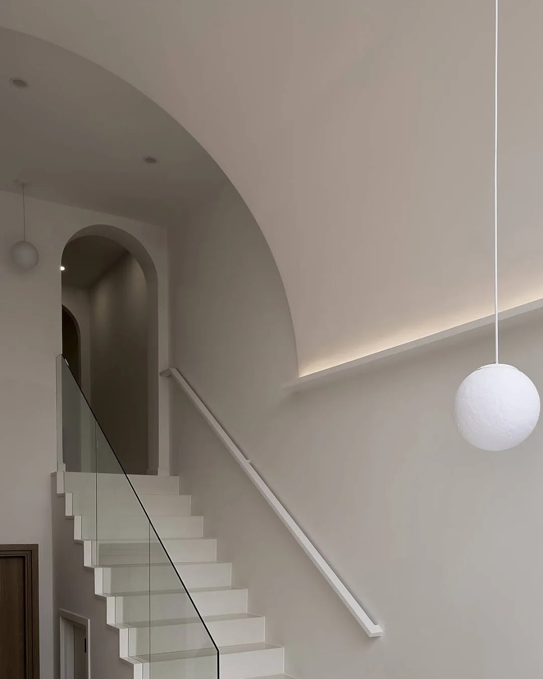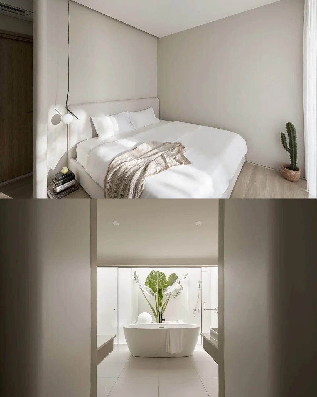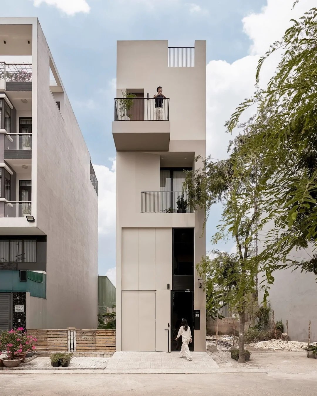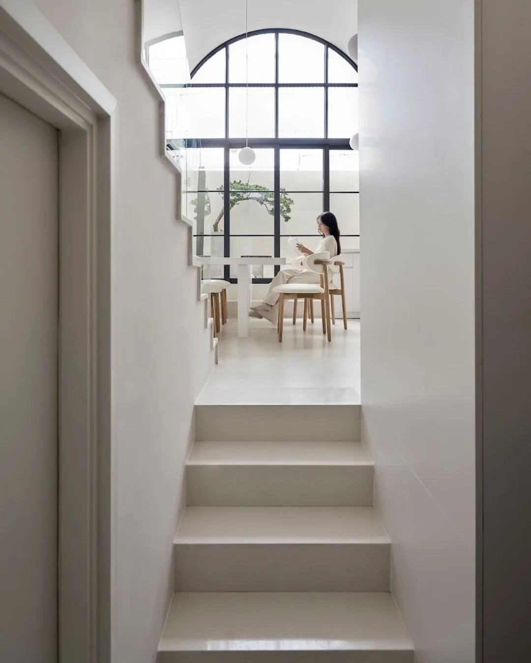 نمای ساختمان نیز بیانیهای قاطع از مینیمالیسم است: عاری از هرگونه تزئینات، با ریتمی از بلوکهای صلب و خالی، عمق و حفظ حریم خصوصی را تضمین میکند. در طراحی داخلی، اتاقهای خواب از طریق پنجرههای قوسی وسیع، با نور طبیعی ملایم آغشته میشوند، در حالی که حمام به صورت یک مینیاسپای با طراحی باز، گیاهان و منحنیهای ظریف، مکانی برای کاهش سرعت زندگی و استراحت طراحی شده است.