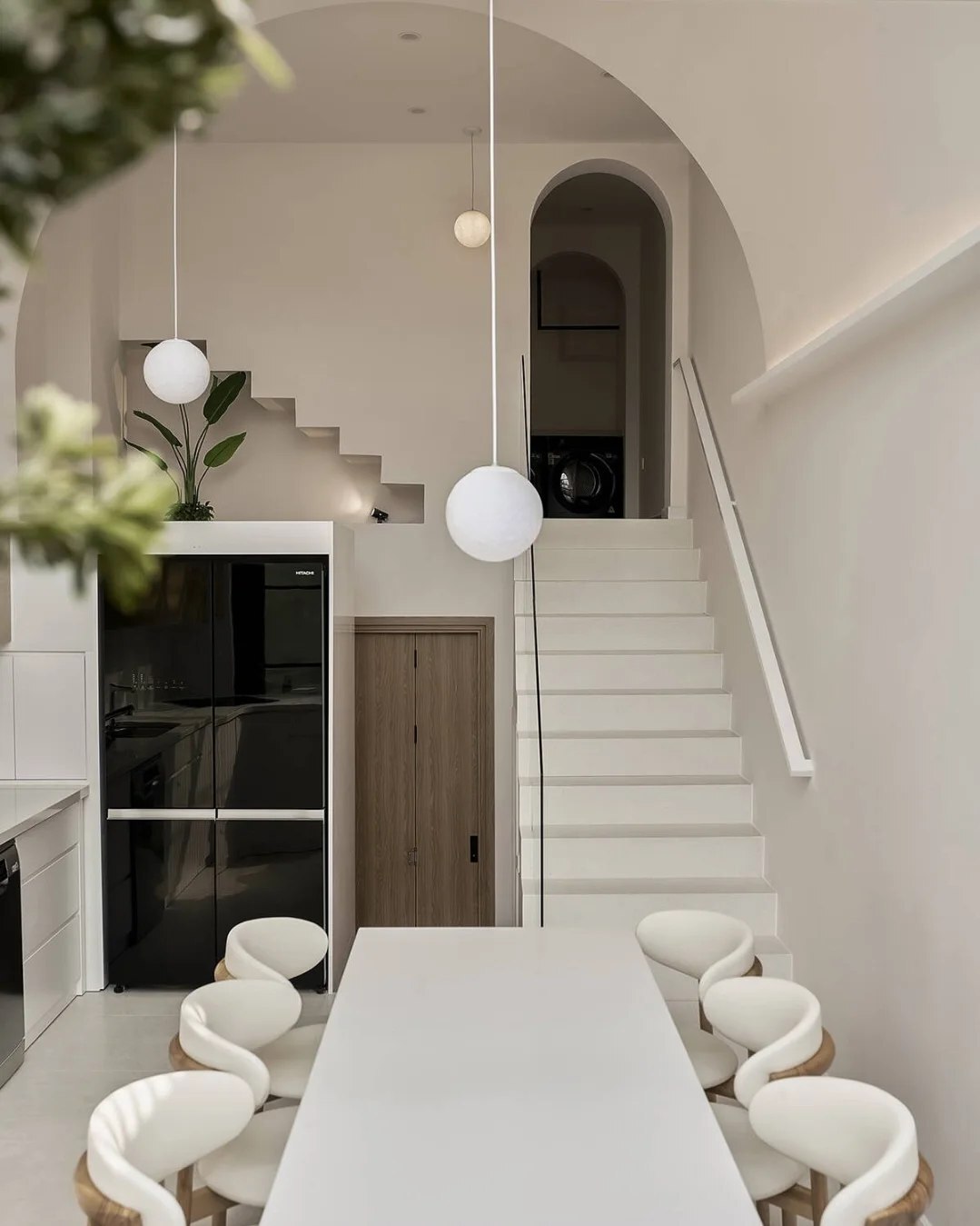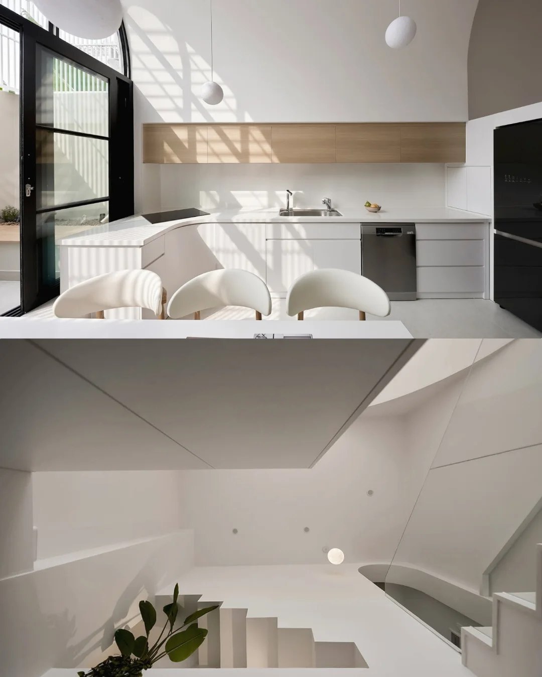 فلسفه محوری طراحی که توسط «P.A.U Architects» صورت گرفته، مینیمالیسم است که به شکلی عمیق و هدفمند در تمام جزئیات نمود پیدا کرده است. برجستهترین عنصر معماری این پروژه، سقف طاقیشکل در قسمت نیمطبقه است؛ این راهحل هوشمندانه برای آزادسازی میدان دید و حذف حس محصور بودن که معمولاً در خانههای باریک و چسبیده به هم رایج است، به فضا تزریق شده و حس وسعت ایجاد میکند.