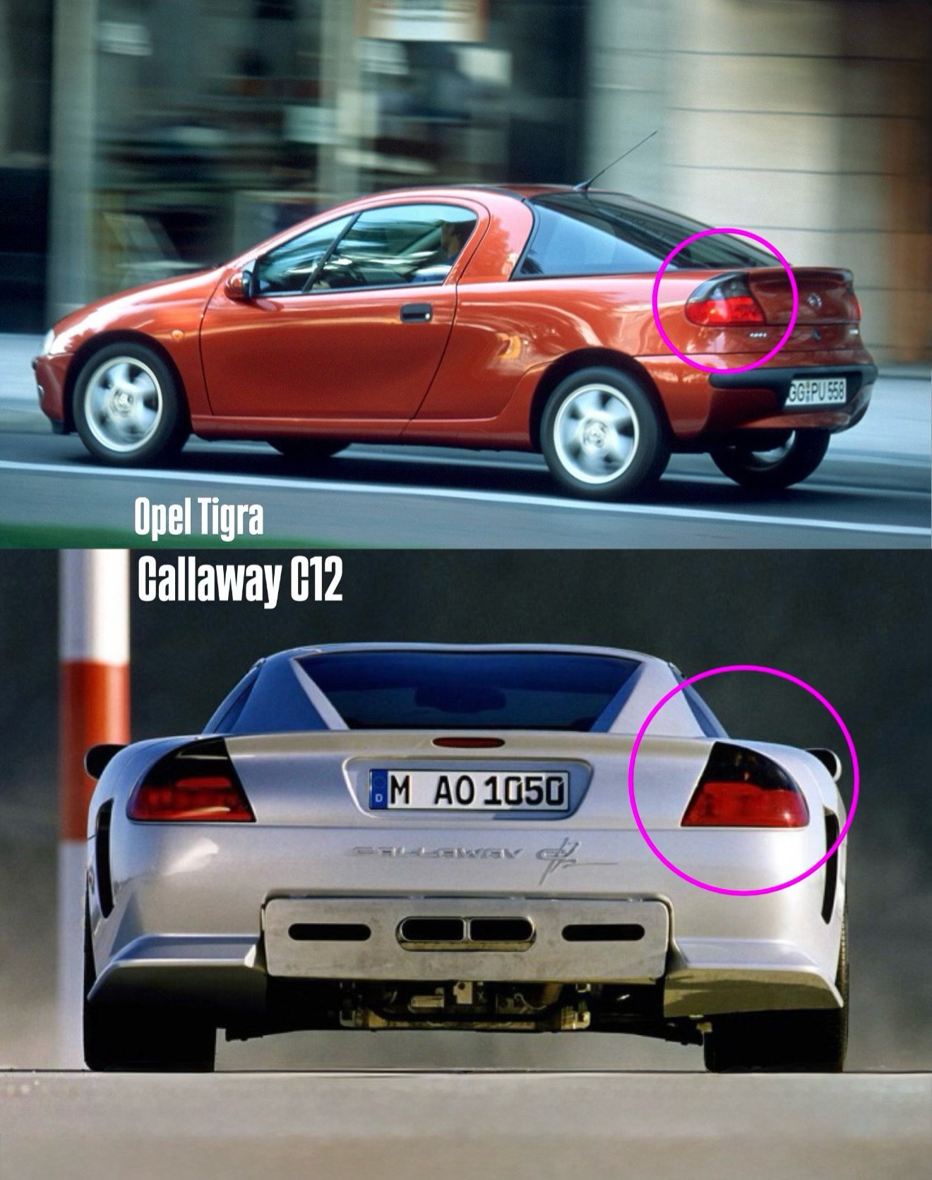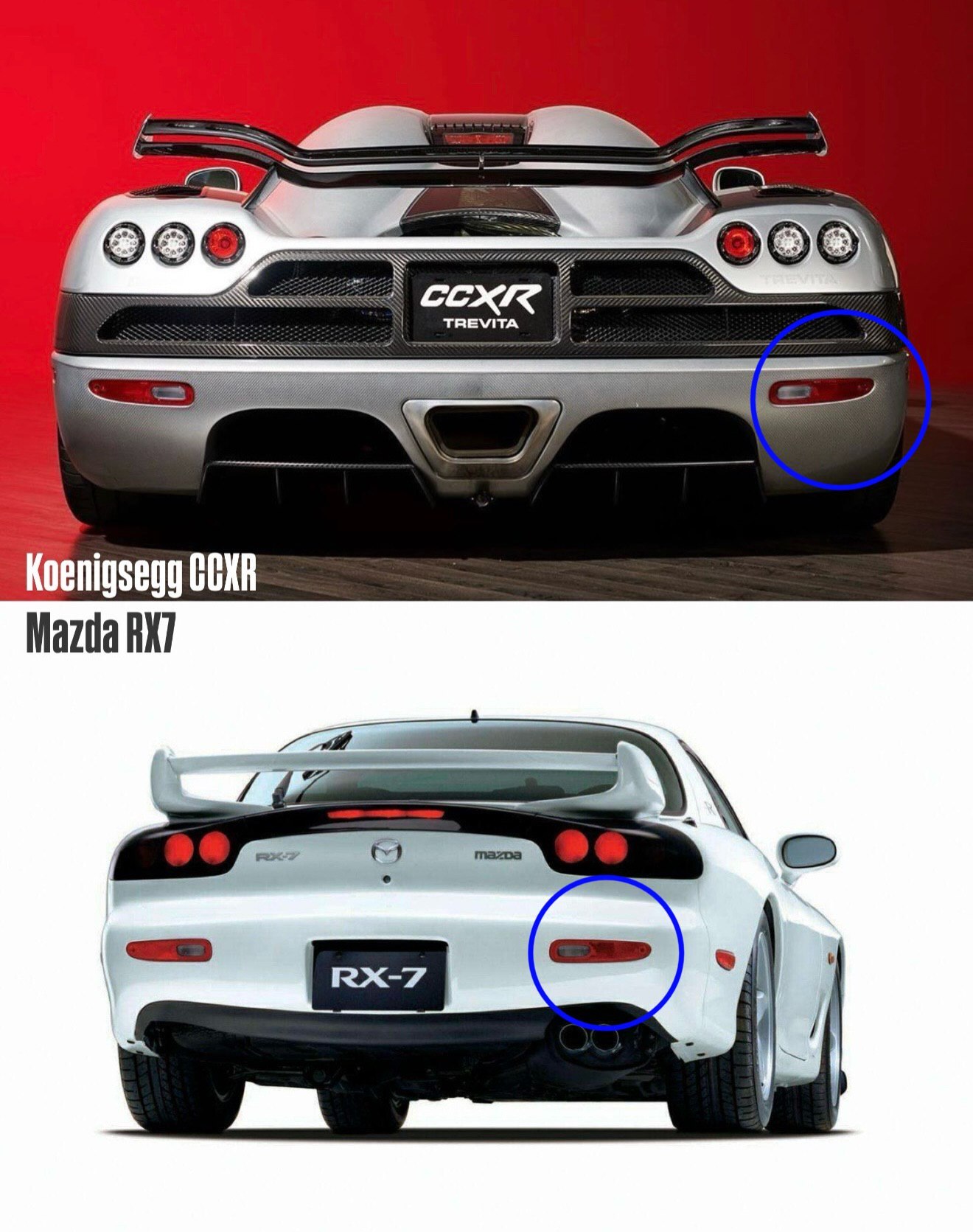 به عنوان مثال، ابرخودروی پاگانی زوندا از چراغهای عقب تراکتور و اتوبوس استفاده کرده است، یا لامبورگینی دیابلو که چراغهای جلوی خود را از نیسان ۳۰۰ZX قرض گرفته بود. در تصاویر جدید منتشر شده، شاهد هستیم که ابرخودرویی همچون کونیگزگ CCXR از همان چراغهای راهنمای عقب بهره میبرد که در مزدا RX7 به کار رفته است.