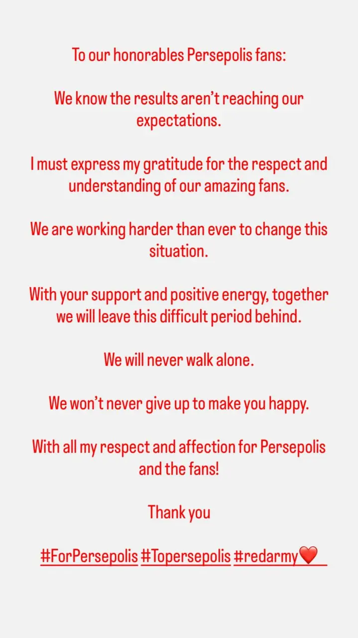 میدانیم که نتایج به انتظارات ما نرسیده است. لازم میدانم از احترام و درک هواداران فوقالعادهمان صمیمانه تشکر کنم. ما سختتر از همیشه کار میکنیم تا این وضعیت را تغییر دهیم.با حمایت و انرژی مثبت شما، با هم این دوران سخت را پشت سر خواهیم گذاشت. ما هرگز تنها قدم نخواهیم زد. ما هرگز از تلاش برای خوشحال کردن شما دست نخواهیم کشید. با نهایت احترام و علاقهام به پرسپولیس و هوادارانش!