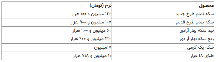 قیمت نیمسکه بهار ۶۰ میلیون و ۹۰۰ هزار تومان، ربع سکه بهار آزادی ۳۳ میلیون و ۹۰۰ هزار تومان و سکه یک گرمی ۱۷ میلیون تومان تعیین شده است.