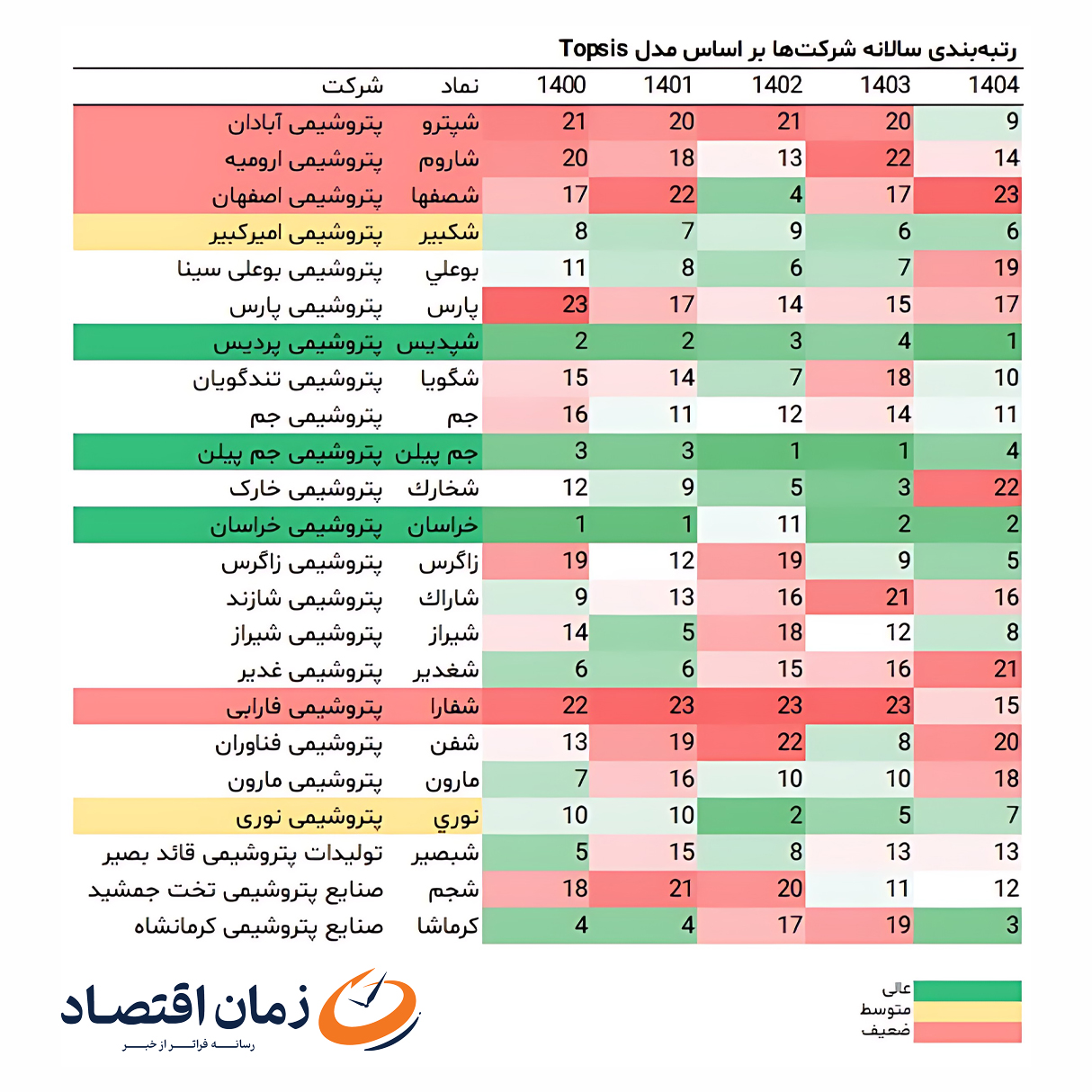 به گزارش خلیج فارس؛ طبق گزارش منتشرشده در «زماناقتصاد» از رتبهبندی سالانه شرکتهای بورسی با مدل TOPSIS در بازه سالهای ۱۴۰۰ تا ۱۴۰۴، پتروشیمی پردیس (شپدیس) در سال ۱۴۰۴ با بهبود جایگاه از رتبه چهارم به رتبه نخست رسیده و در صدر این ارزیابی قرار گرفته است.