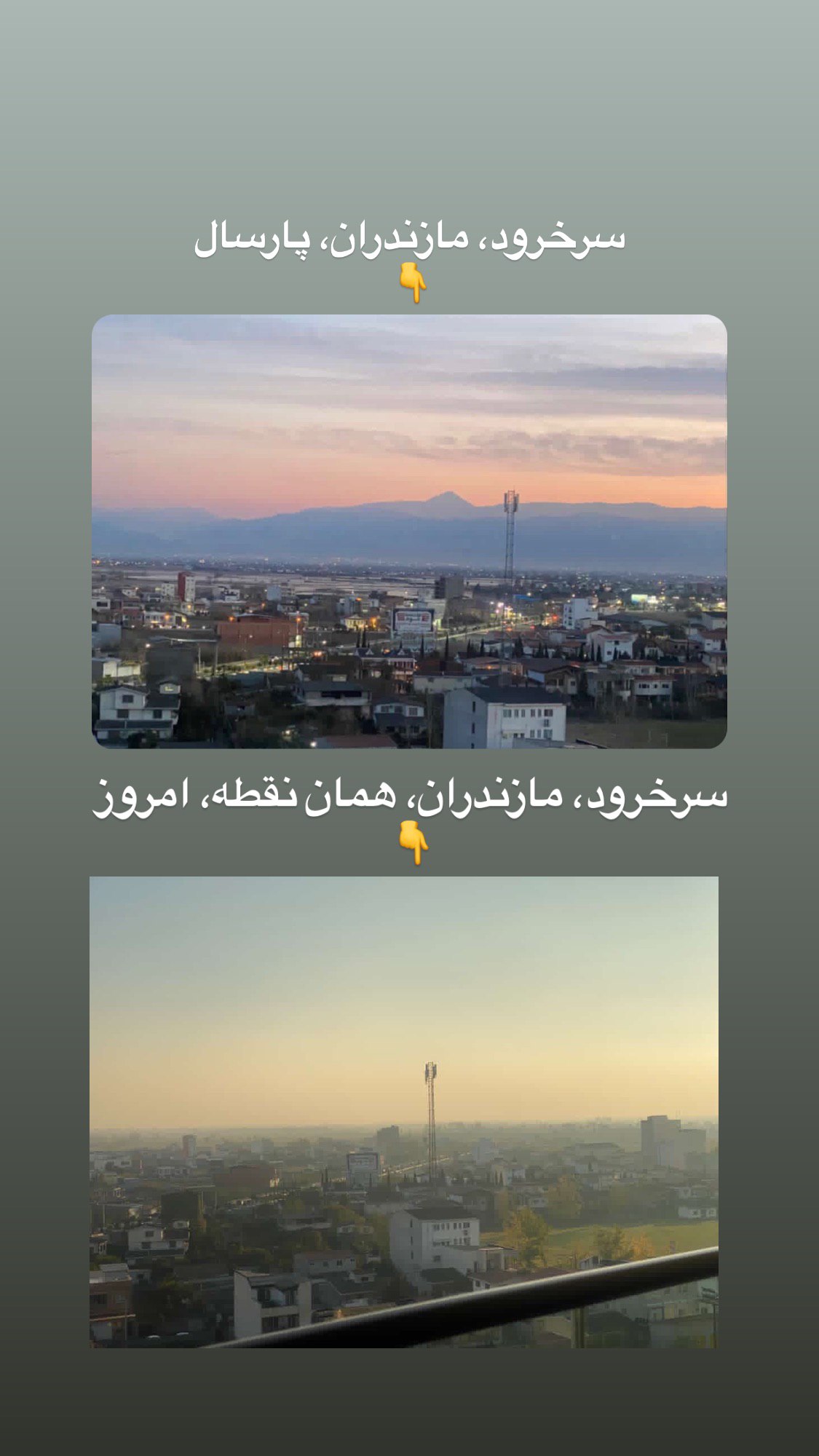 خلیج فارس: تصویر مقایسهای از شهر سُرخرود در مازندران، یکی مربوط به سال گذشته و دیگری متعلق به دیروز، در شبکههای اجتماعی دستبهدست میشود و آلودگی هوا را در این منطقه شمالی کشور نشان میدهد.