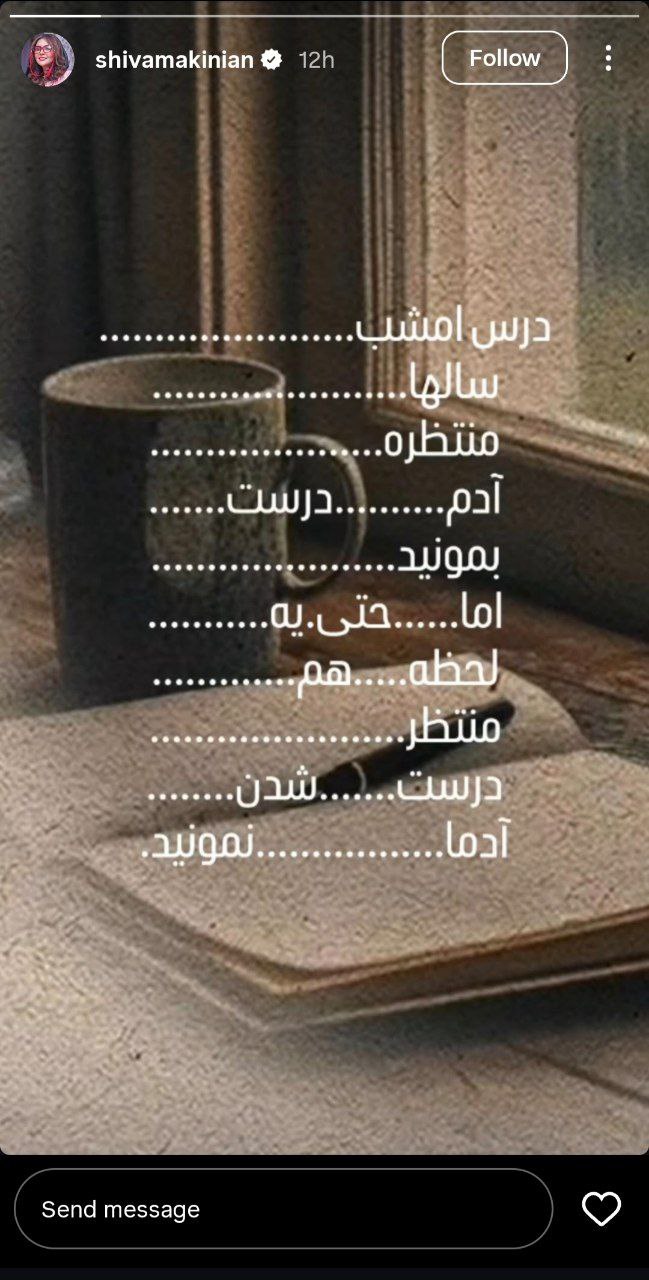 به گزارش«خلیج فارس» به نقل از برترینها؛ شیوا مکینیان بازیگر سریال پایتخت یک استوری با متنی معنادار را در اینستاگرام منتشر کرد که در ادامه میبینید.