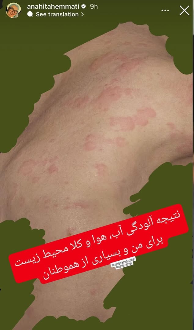 او توضیح داد که آلودگی شدید هوای تهران باعث ایجاد خارش، التهاب و تاولهای ریز روی پوستش شده و این مشکل طی چند روز گذشته شدت گرفته است.