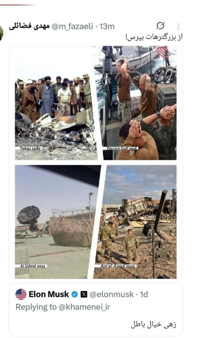 به گزارش«خلیج فارس» به نقل از برترینها؛ مهدی فضائلی عضو دفتر حفظ و نشر آثار رهبر معظم انقلاب در واکنش به توئیت ایلان ماسک، با انتشار ۴ تصویر تاریخی (طوفان طبس ۱۹۸۰ – توقف و بازداشت قایق آمریکایی در خلیج فارس ۲۰۱۶ – حمله موشکی سپاه به پایگاه آمریکایی عین الاسد در عراق ۲۰۲۰ – پاسخ موشکی ایران و حمله به پایگاه آمریکایی العدید در قطر ۲۰۲۵)، نوشت: از بزرگترهات بپرس…!