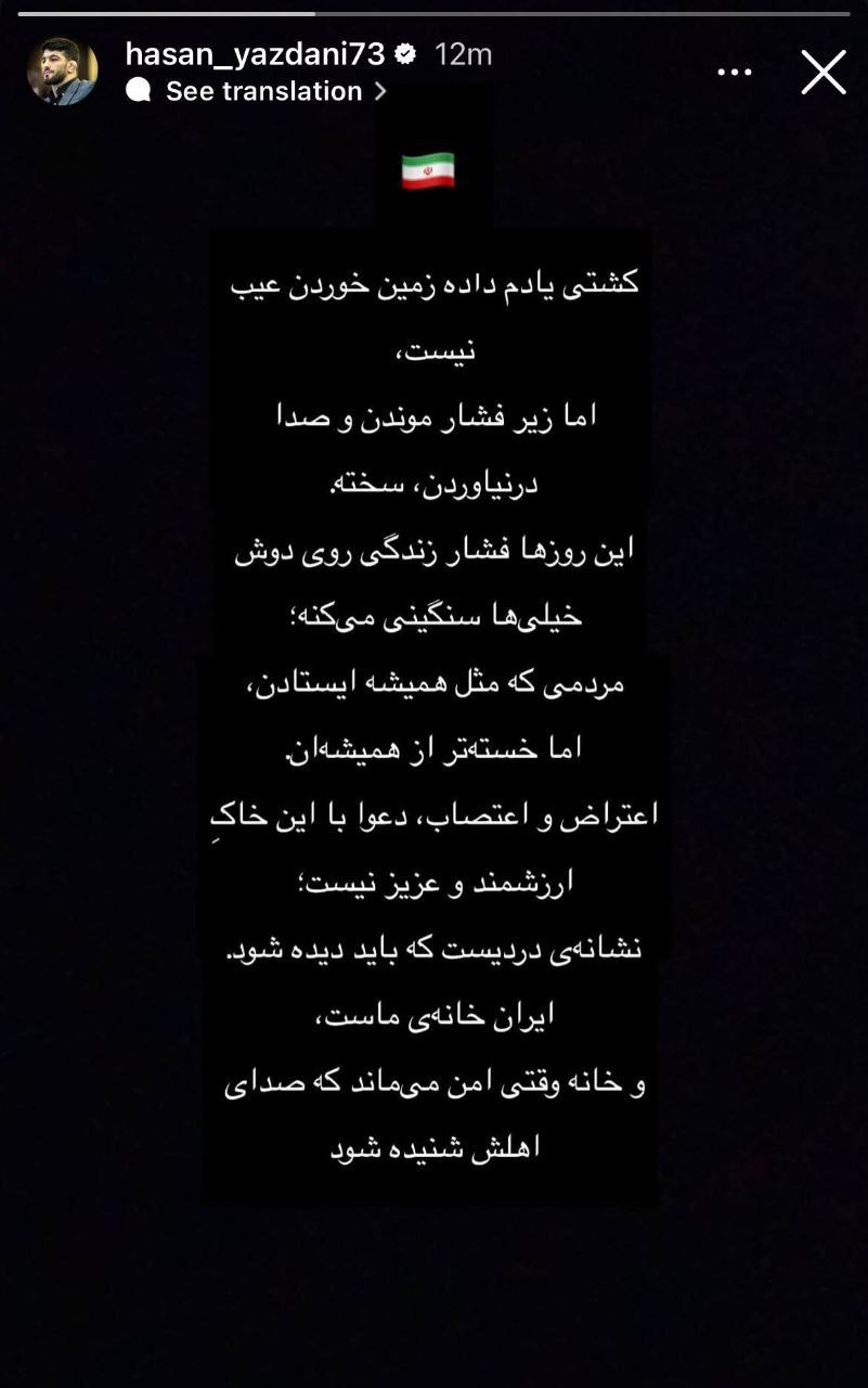 خلیج فارس:حسن یزدانی، قهرمان کشتی ایران، با انتشار یک استوری در صفحه شخصیاش نسبت به اعتراضات مردمی به گرانی و وضعیت اقتصادی واکنش نشان داد.