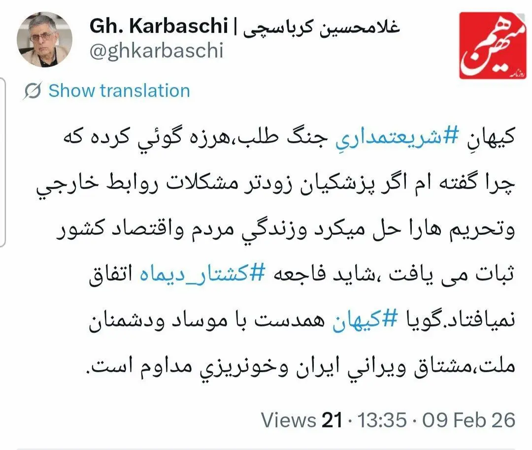 کیهانِ شریعتمداریِ جنگ طلب، هرزه گوئی کرده که چرا گفته ام اگر پزشکیان زودتر مشکلات روابط خارجی و تحریمها را حل میکرد و زندگی مردم و اقتصاد کشور ثبات می یافت، شاید فاجعه کشتار دیماه اتفاق نمیافتاد. گویا کیهان همدست با موساد و دشمنان ملت، مشتاق ویرانی ایران و خونریزی مداوم است.