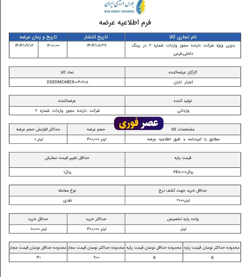 به گزارش«خلیج فارس» به نقل از خبرگزاری فارس؛بورس انرژی ایران اعلام کرده است که عرضه رسمی بنزین سوپر وارداتی از دوم آذر آغاز میشود. بر اساس اطلاعیه این بورس، قیمت پایه برای هر لیتر بنزین سوپر در نخستین عرضه، ۶۵ هزار و ۸۰۰ تومان تعیین شده است. این نخستین بار پس از ماههاست که بنزین سوپر وارداتی در قالب رینگ بینالملل بورس انرژی عرضه میشود.