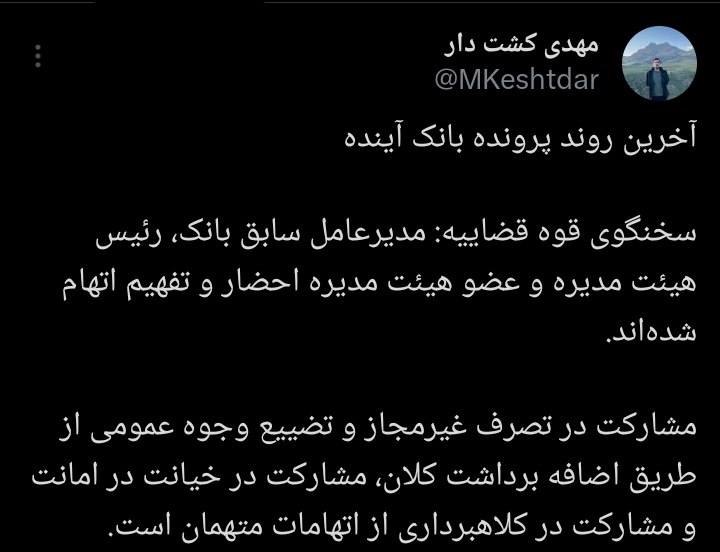 به گزارش«خلیج فارس» به نقل از برترینها؛مهدی کشتدار درباره آخرین روند این پرونده نوشت: سخنگوی قوه قضائیه: مدیرعامل سابق بانک ، رئیس هیئت مدیرهو عضو هیئت مدیره احضار و تفهیم اتهام شده اند.