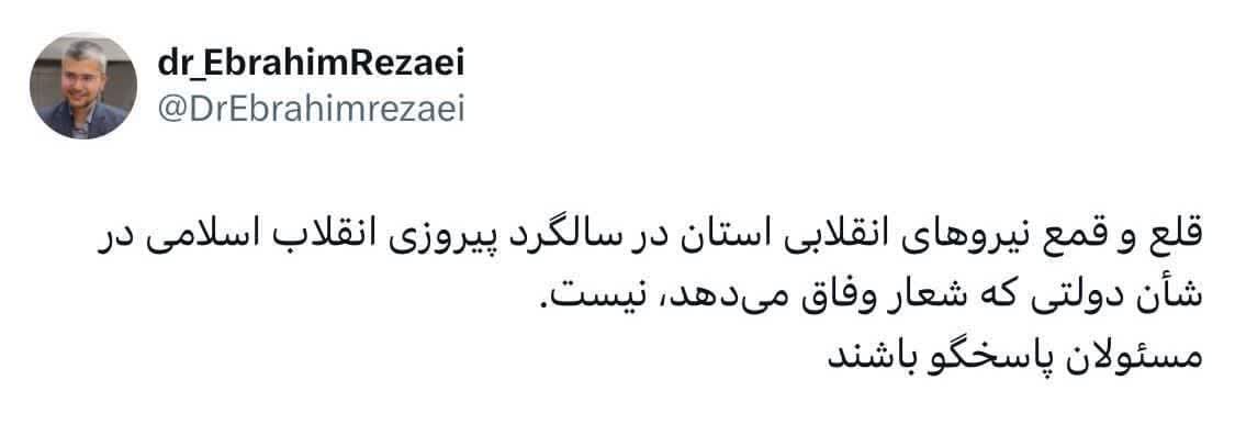 به گزارش خلیج فارس؛ ابراهیم رضایی با انتشار توئیتی نوشت: «قلع و فمع نیروهای انقلابی استان در سالگرد پیروزی انقلاب اسلامی در شان دولتی که شعار وفاق می دهد، نیست.