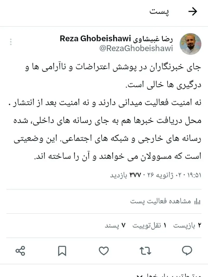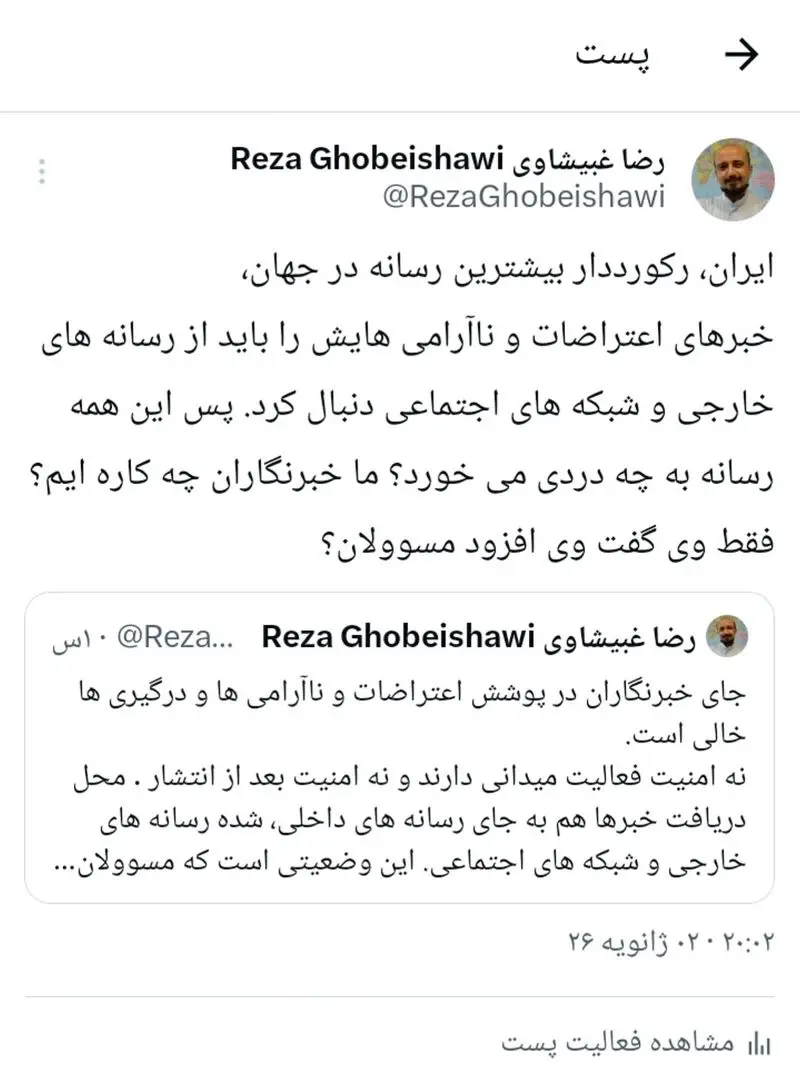 رضا غبیشاوری نوشت: جای خبرنگاران در پوشش اعتراضات و ناآرامی ها و درگیری ها خالی است. نه امنیت فعالیت میدانی دارند و نه امنیت بعد از انتشار . محل دریافت خبرها هم به جای رسانه های داخلی، شده رسانه های خارجی و شبکه های اجتماعی. این وضعیتی است که مسوولان می خواهند و آن را ساخته اند.