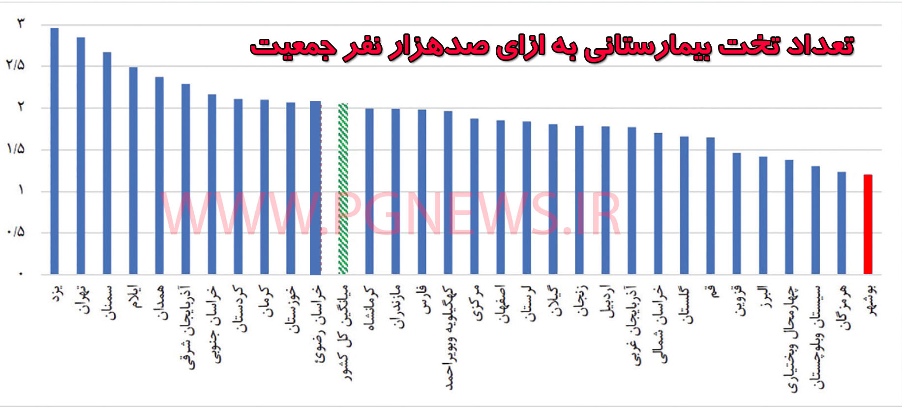 در این نمودار که مربوط به نیمه اول سالجاری است، وضعیت استان ها براساس شاخص «تخت بیمارستانی به ازای هر 100 هزار نفر» اعلام شده که بوشهر با شاخص 1.2 تخت بیمارستانی، در رتبه آخر می باشد.