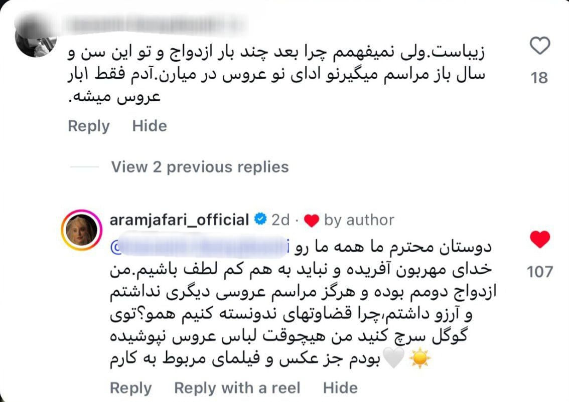 خلیج فارس:آرام جعفری، بازیگر سینما و تلویزیون که بهتازگی با بابک انصاری ازدواج کرده است، در واکنش به حواشی مربوط به ازدواج دومش توضیحاتی ارائه داد.
