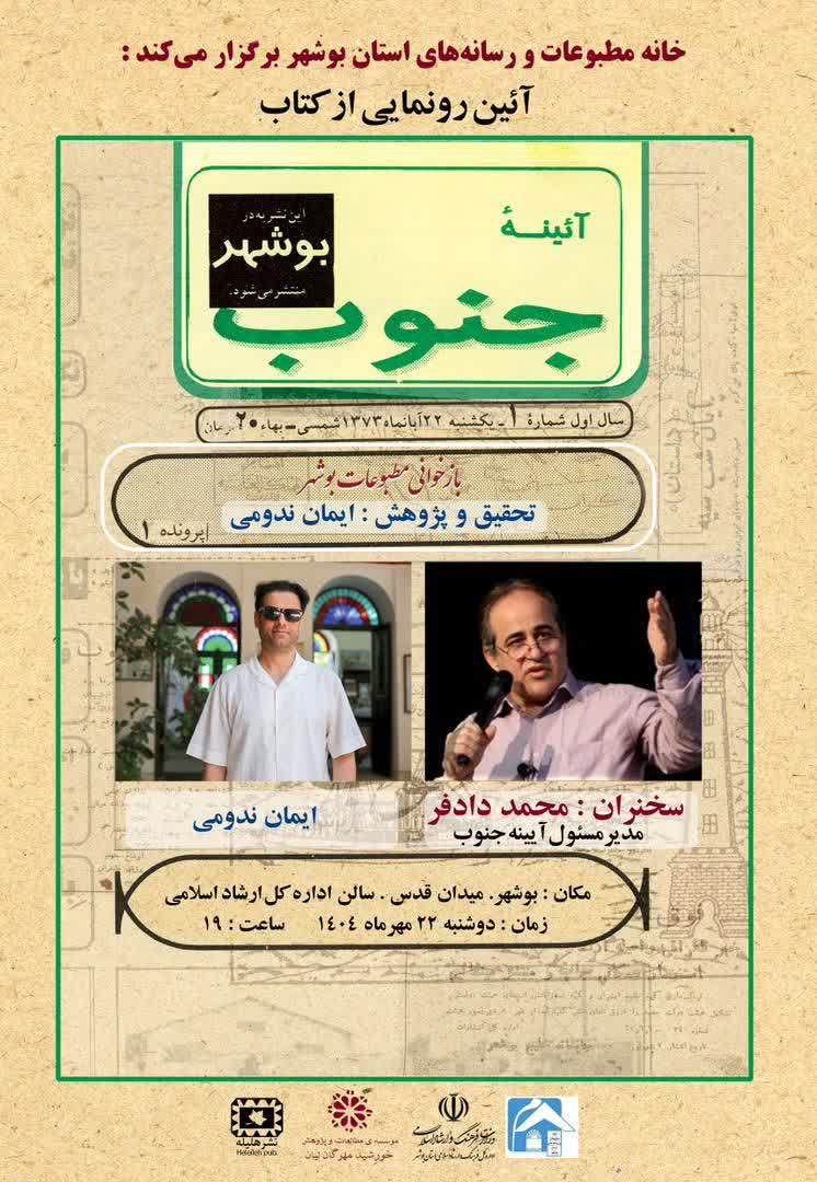 خلیج فارس: جلد نخست مجموعه پژوهشی «بازخوانی مطبوعات بوشهر پس از سال 1357» به قلم ایمان ندومی، روزنامهنگار بوشهری، با عنوان آیینه جنوب منتشر شد.