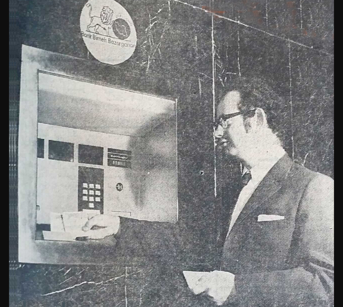 «اولین باجه اتوماتیک کامپیوتری شروع به کار کرد. آقای «راد ـ لون» مسئول آموزش موسسه «باروس» کارت اعتبار نقدی خود را در محل مخصوص باجه اتوماتیک کامپیوتری قرار میدهد ۱۰ ثانیه بعد، پول نقد مورد نیاز به طور اتوماتیک در اختیار آقای «لون» قرار خواهد گرفت. این عکس، بامداد امروز در مراسم آغاز کار اولین باجه اتوماتیک کامپیوتری در شعبه مرکزی بانک بیمه بازرگانان گرفته شده است. باجه اتوماتیک بانک بیمه بازرگانان، نخستین دستگاه کامپیوتری است که در خاورمیانه آغاز بکار میکند.»