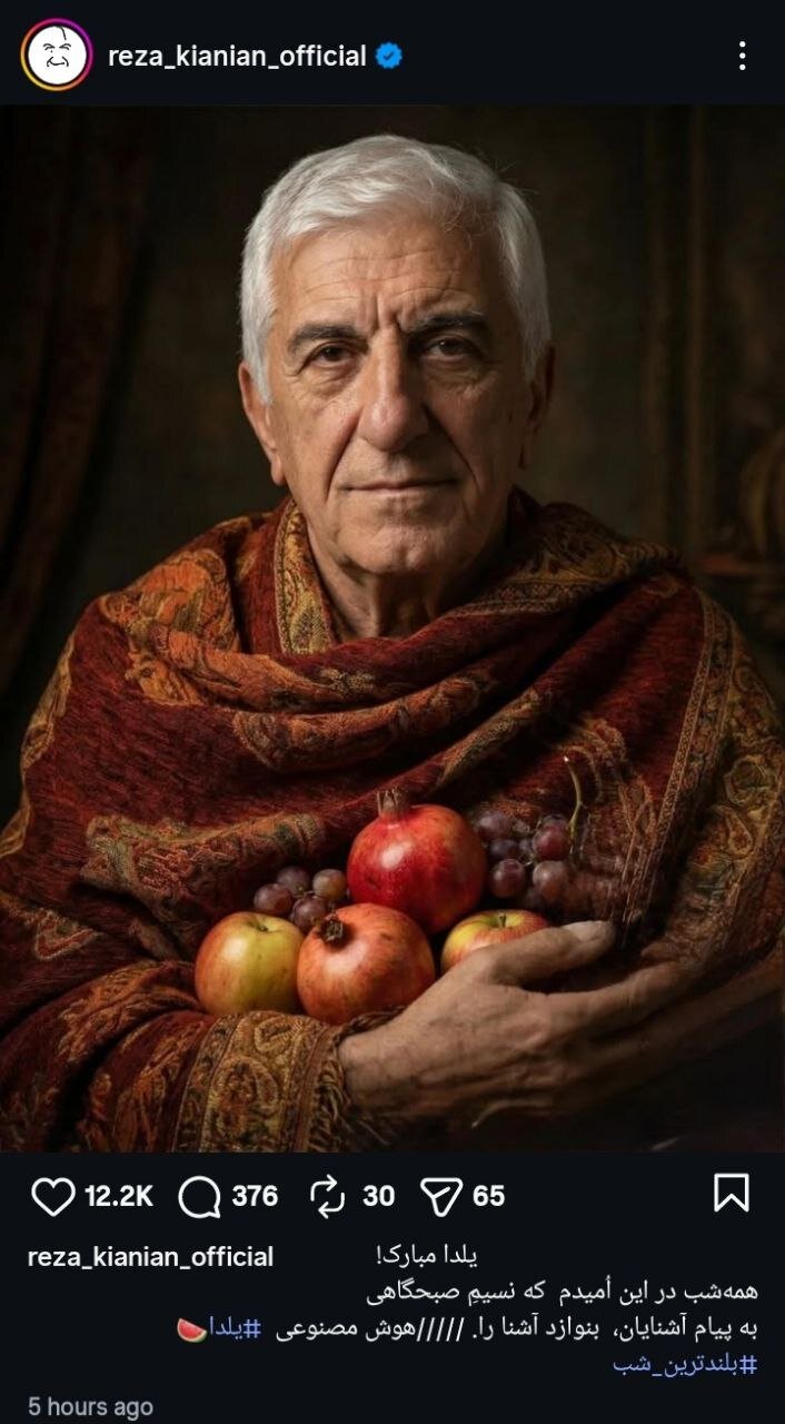 خلیج فارس:رضا کیانیان با کمک هوش مصنوعی یلدا را تبریک گفت.