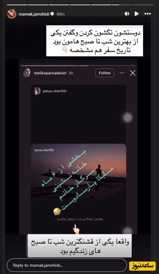 به گزارش«خلیج فارس» به نقل از برترینها؛مامک جمشیدی، خواهر پژمان جمشیدی با بازنشر پیام یکی از مخاطبان صفحه اش در واکنش به این پرسش که «آیا پژمان به ایران برخواهد گشت؟» نوشت: «تا چند روز دیگه پژمان برمیگرده ایران و قوی تر از قبل کنارتونه»